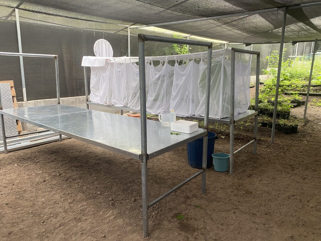 Auch in der Raupenzucht gab es Fortschritte: galvanisierte Tische wurden geschweisst, die langlebig sind und eine hygienische Aufzucht ermöglichen. Darüber stehen weisse Schutznetze, in denen sich die Raupen ungestört sattfressen können – sicher vor ihren natürlichen Feinden.